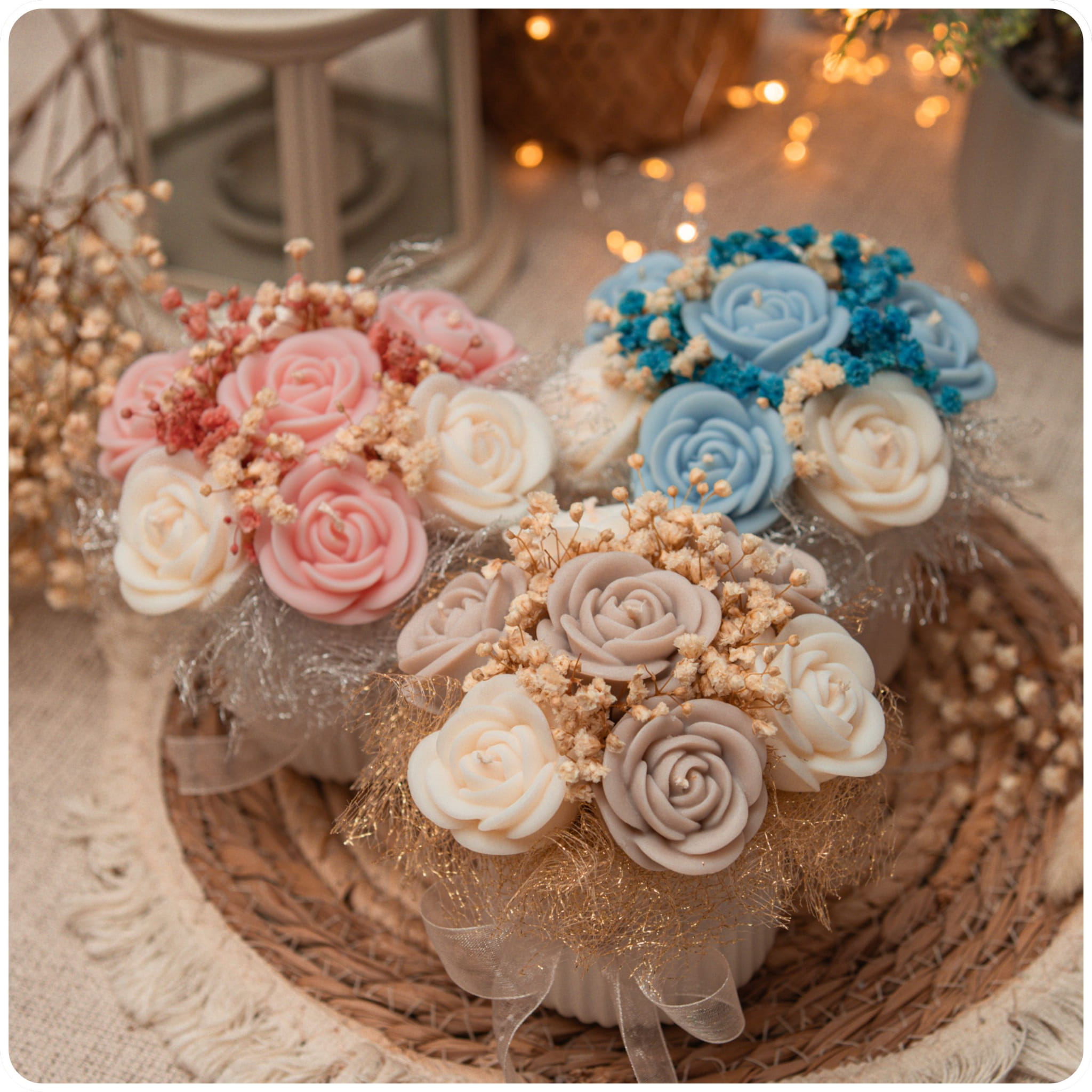 - ✅ Wyjątkowy design: Urocze Róże z Wosku Sojowego z dodatkami z gipsówki i organzy w stylowym pojemniczku z gipsu polimerowego.