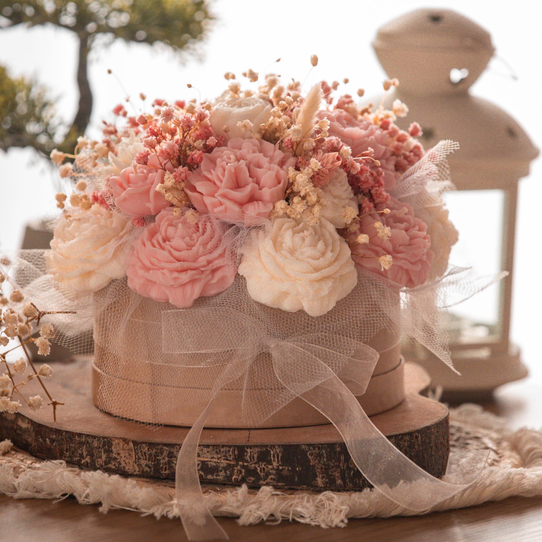 BOX SKŁADA SIĘ Z EKO PUDEŁKA, ŚWIEC SOJOWYCH W KSZTAŁCIE KWIATÓW W DWÓCH KOLORACH ORAZ DODATKÓW W POSTACI GIPSÓWKI ORAZ TIULU.