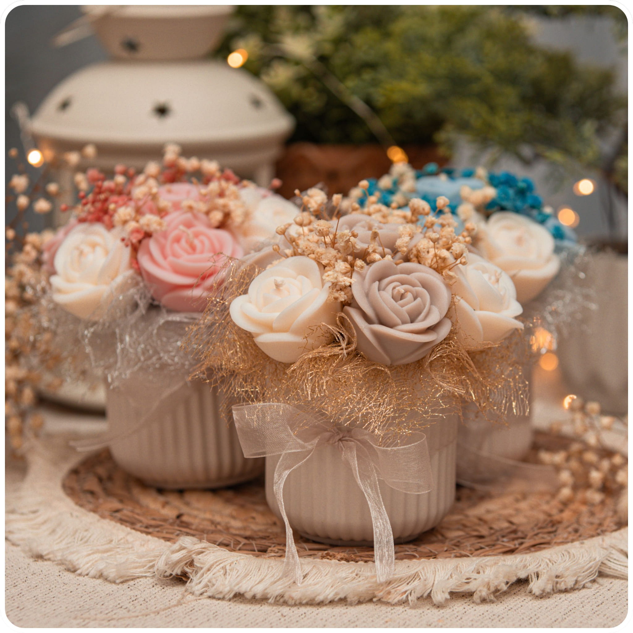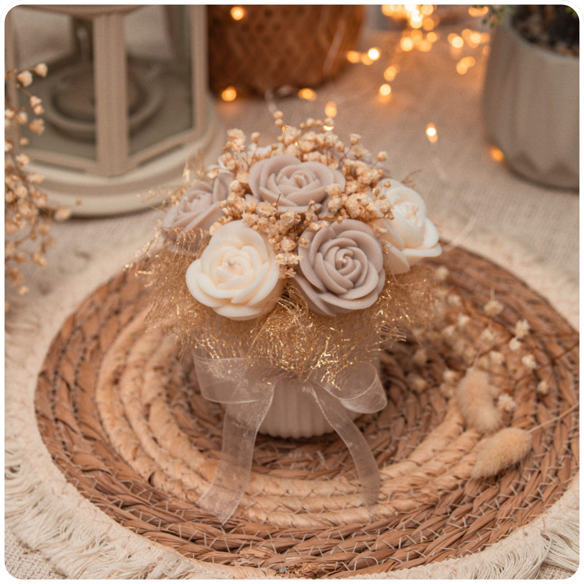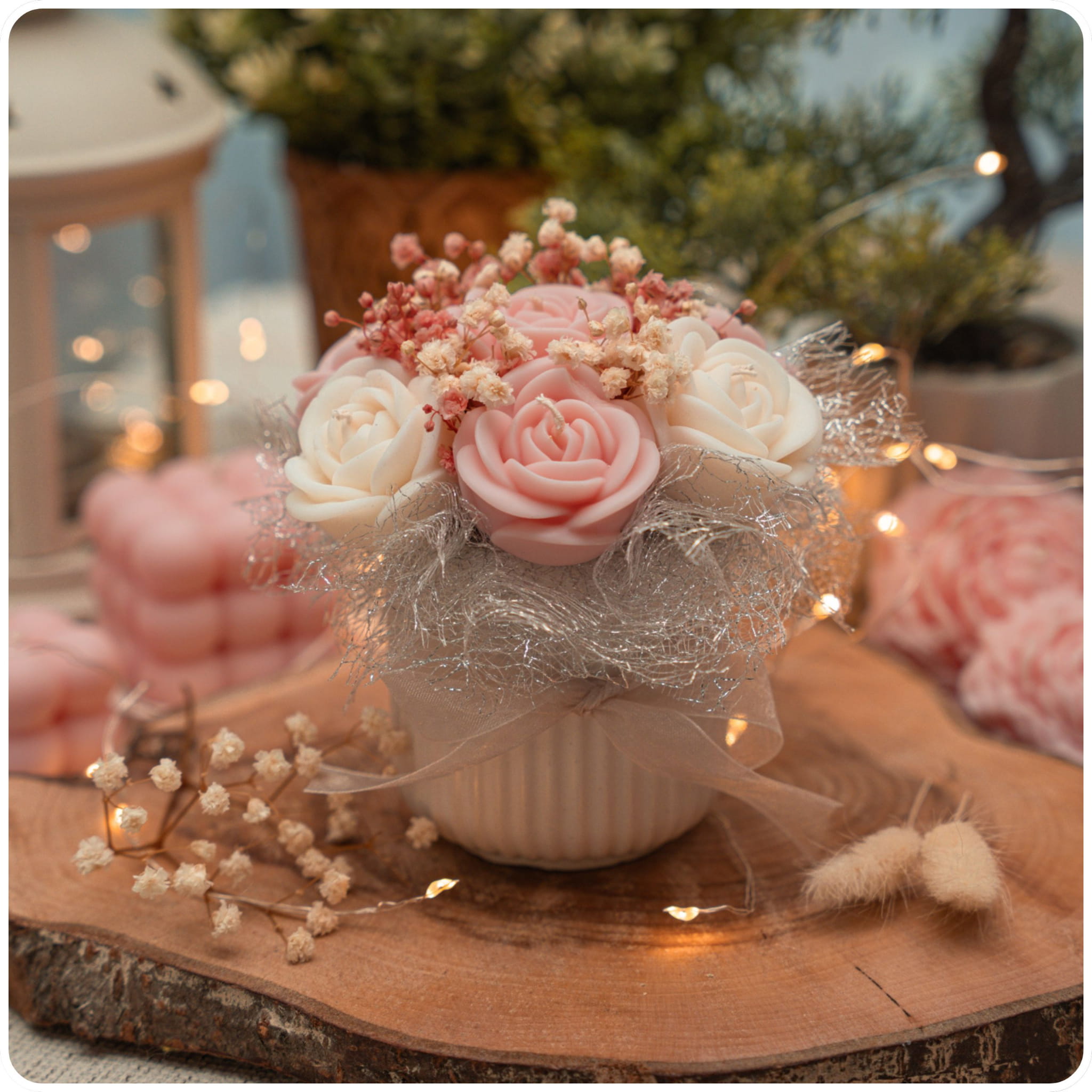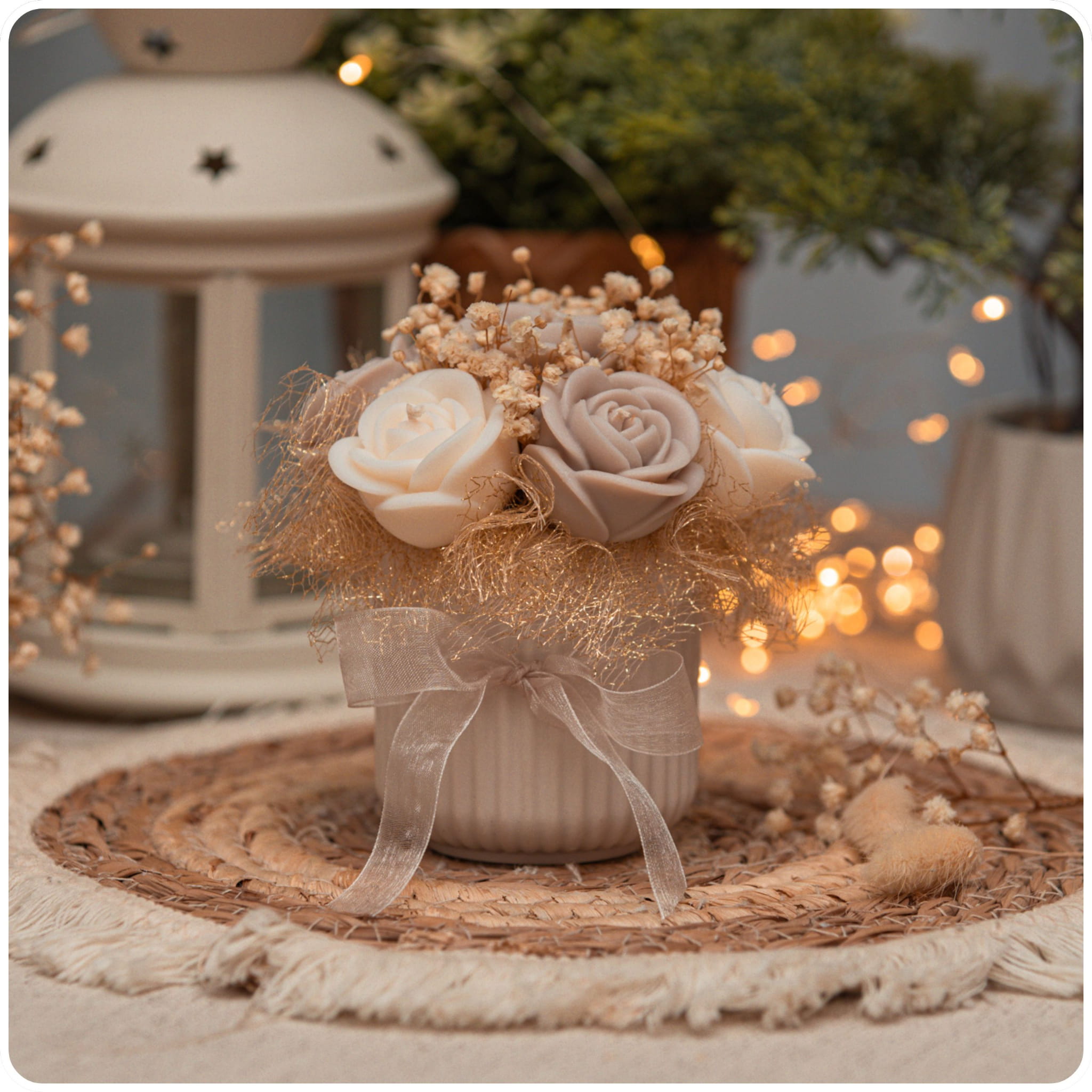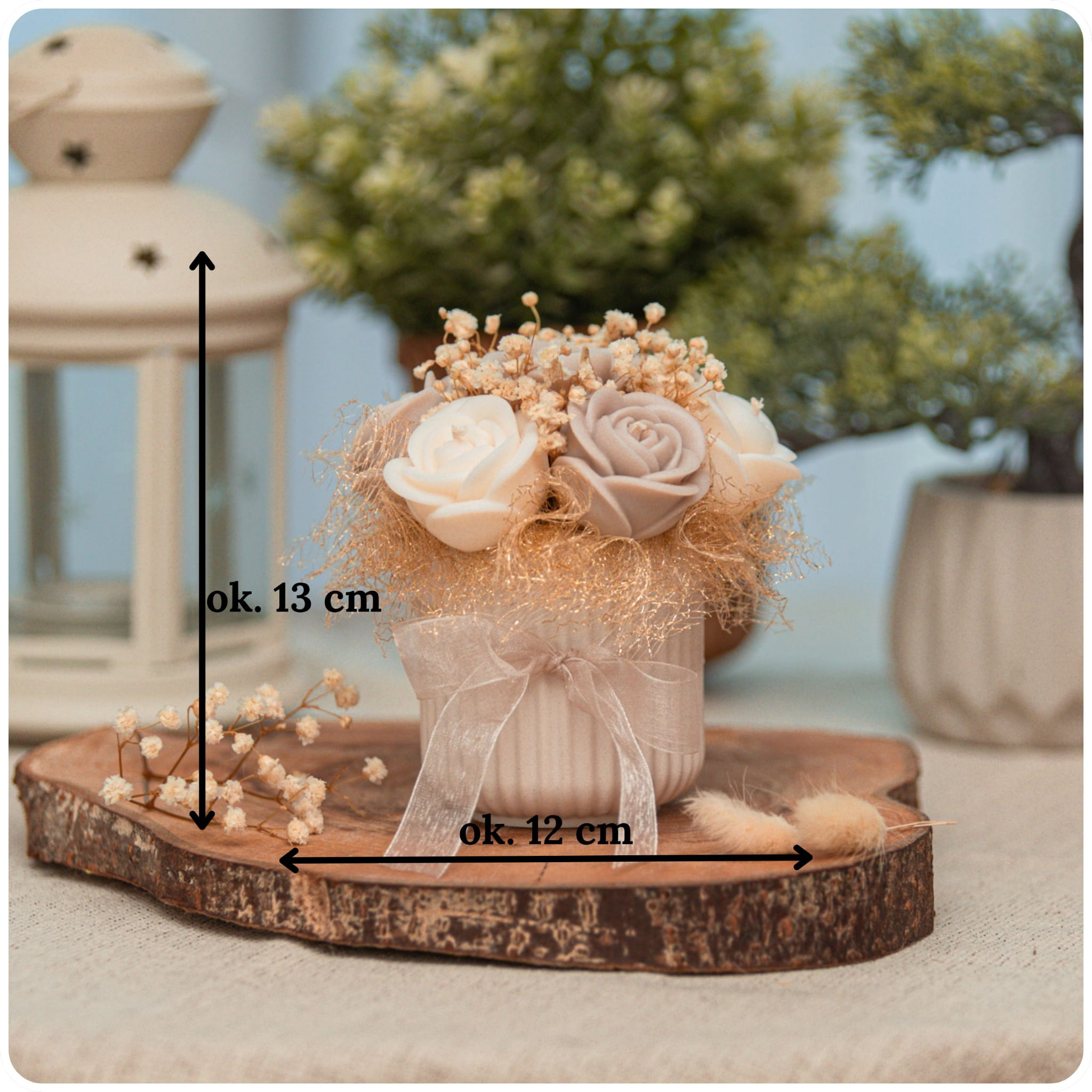 - ✅ Wyjątkowy design: Urocze Róże z Wosku Sojowego z dodatkami z gipsówki i organzy w stylowym pojemniczku z gipsu polimerowego.