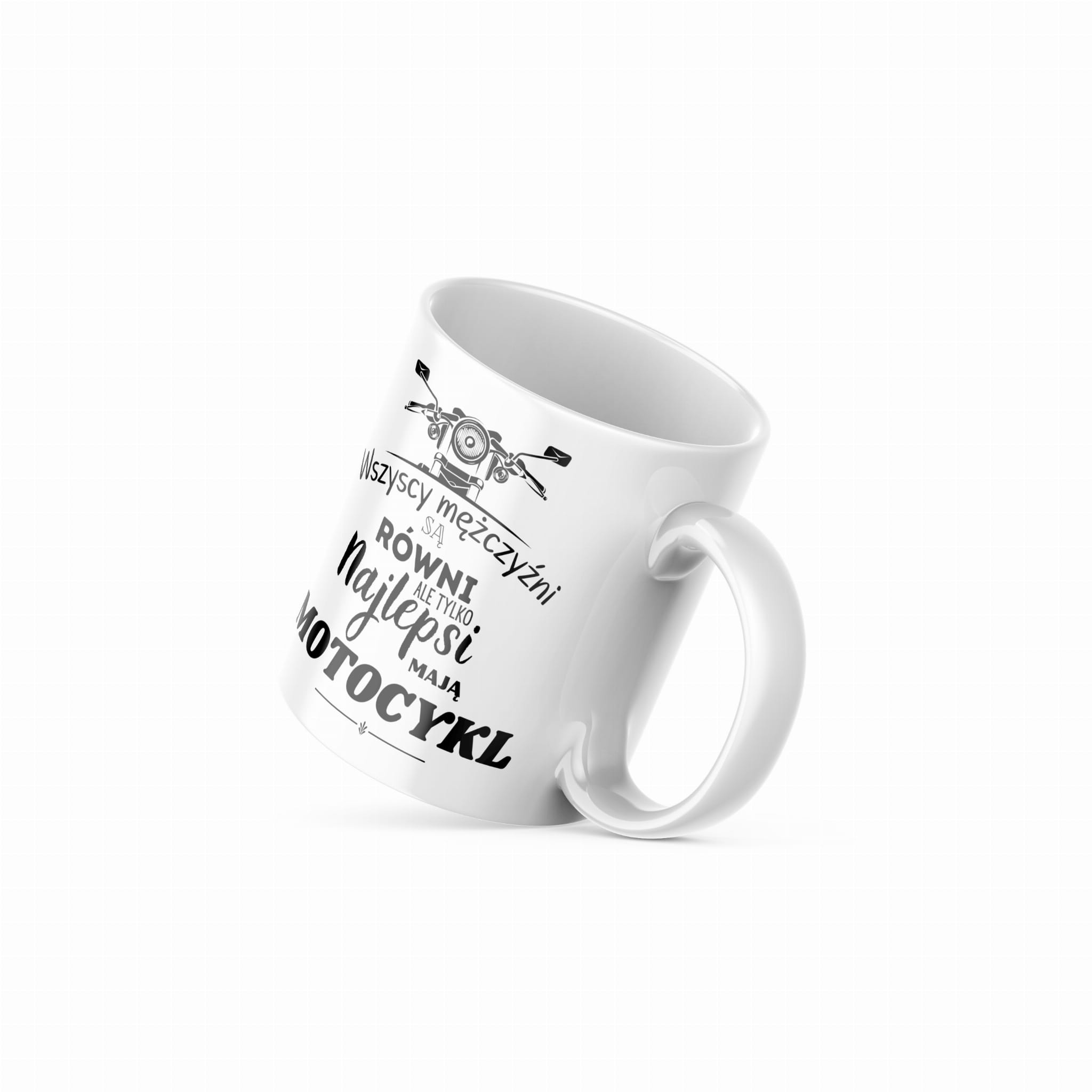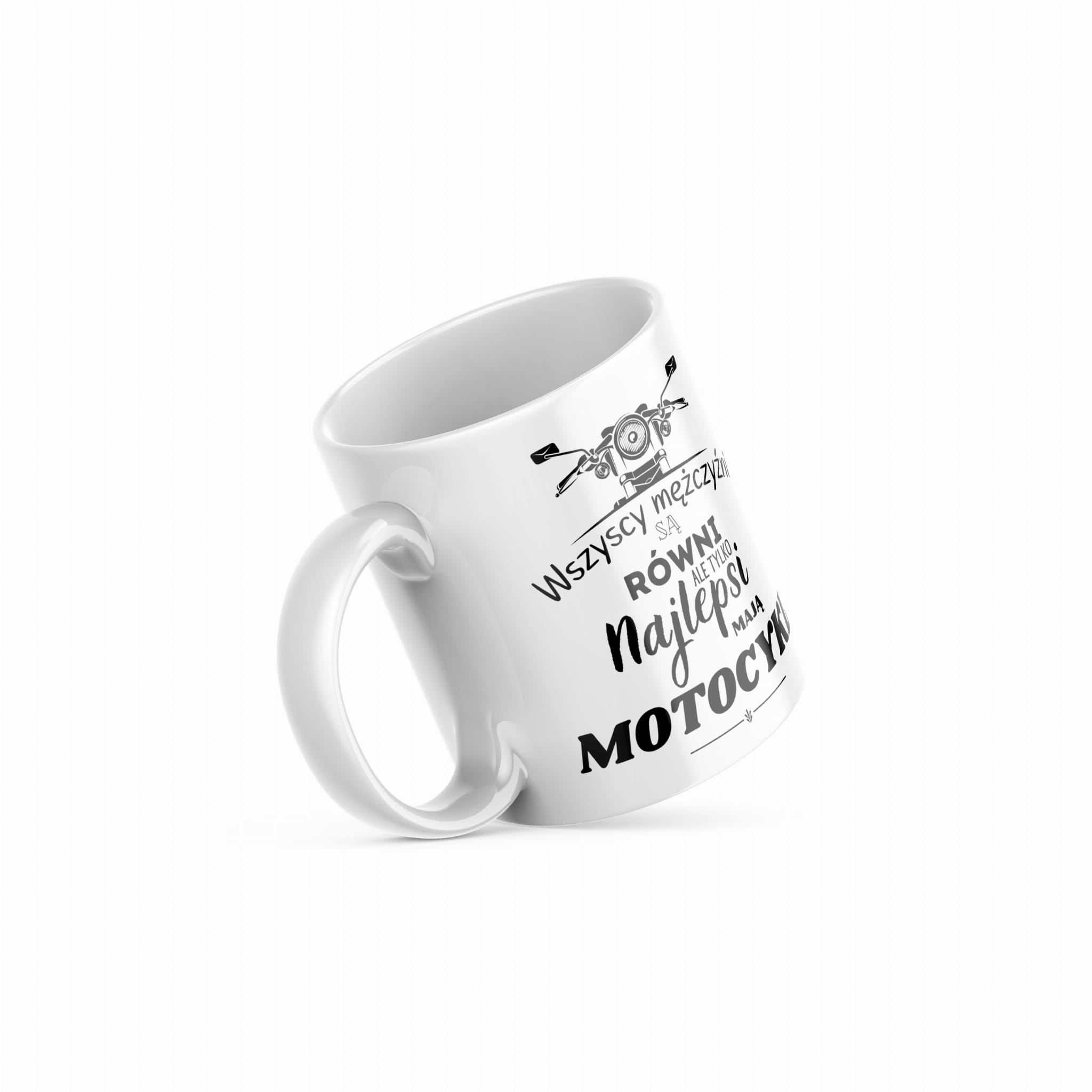 STYLOWY BIAŁY KUBEK o pojemności 330 ml z napisem "Wszyscy mężczyźni są Równi ale tylko najlepsi mają Motocykl"