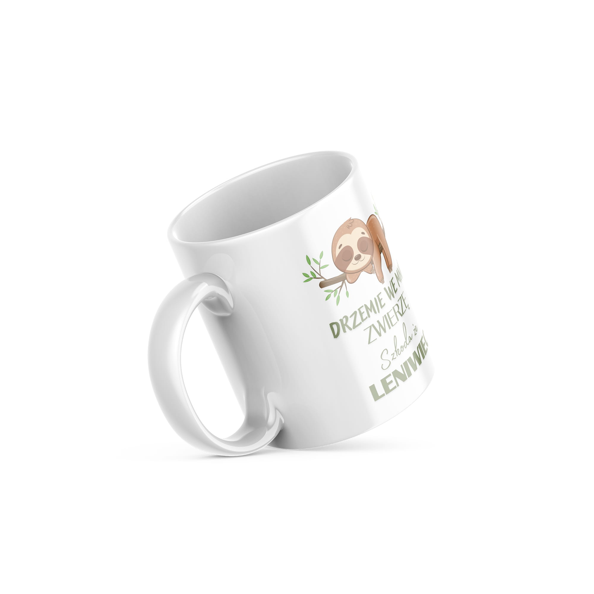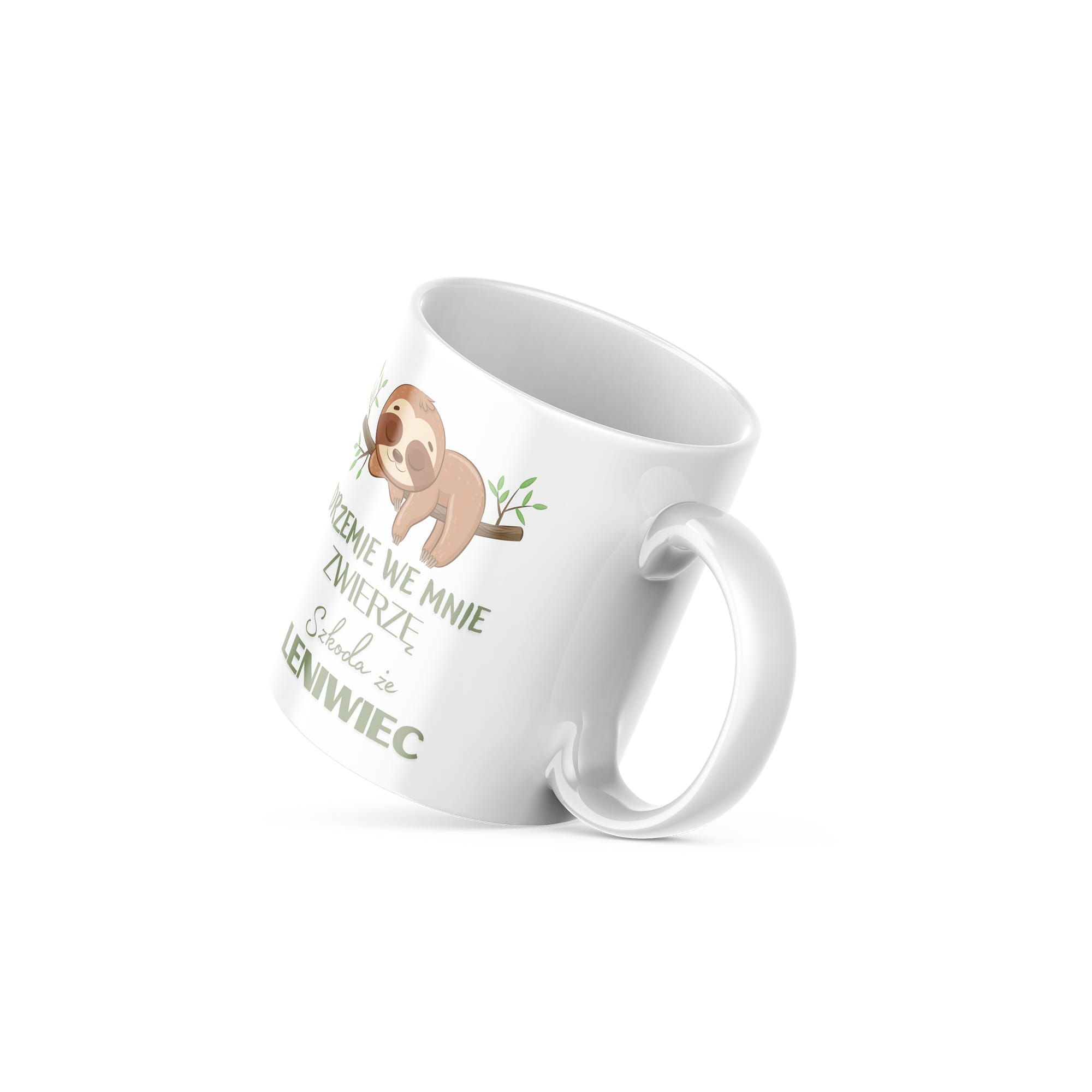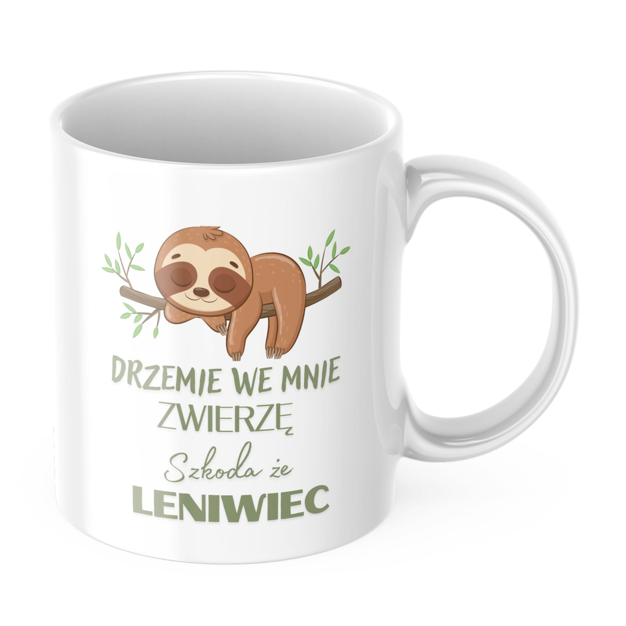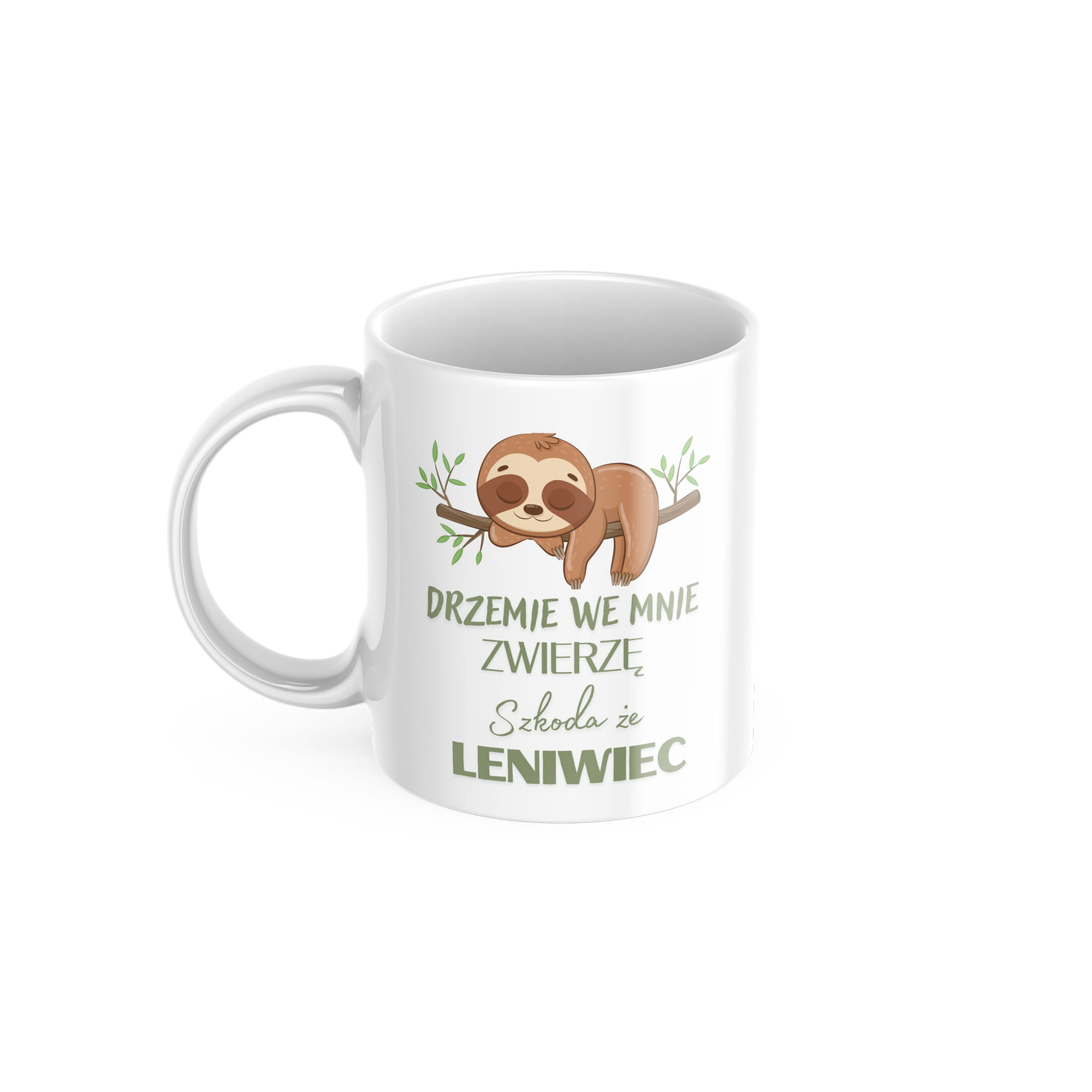 Kubek o pojemności 330 ml z napisem „Drzemie we mnie zwierzę, szkoda że leniwiec”