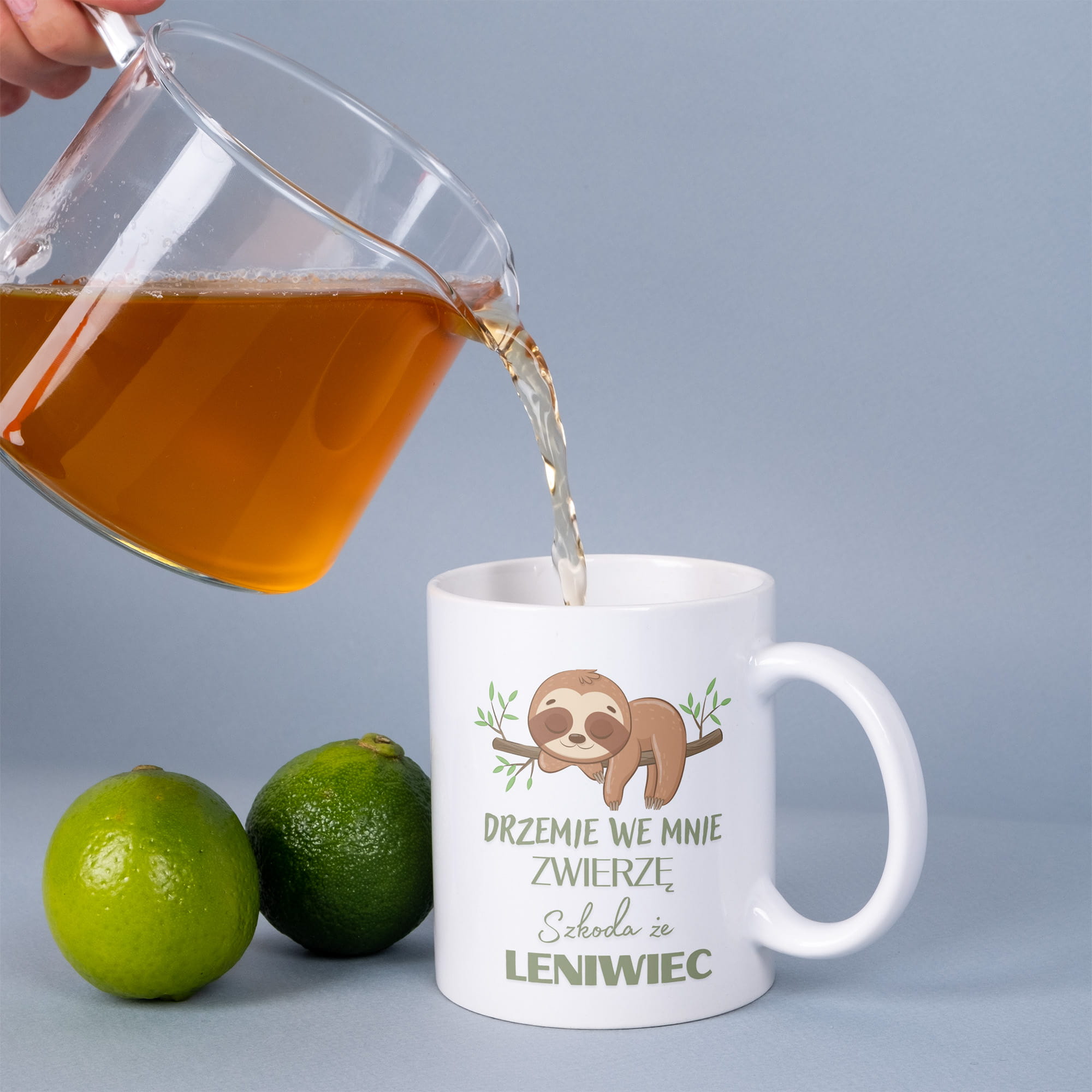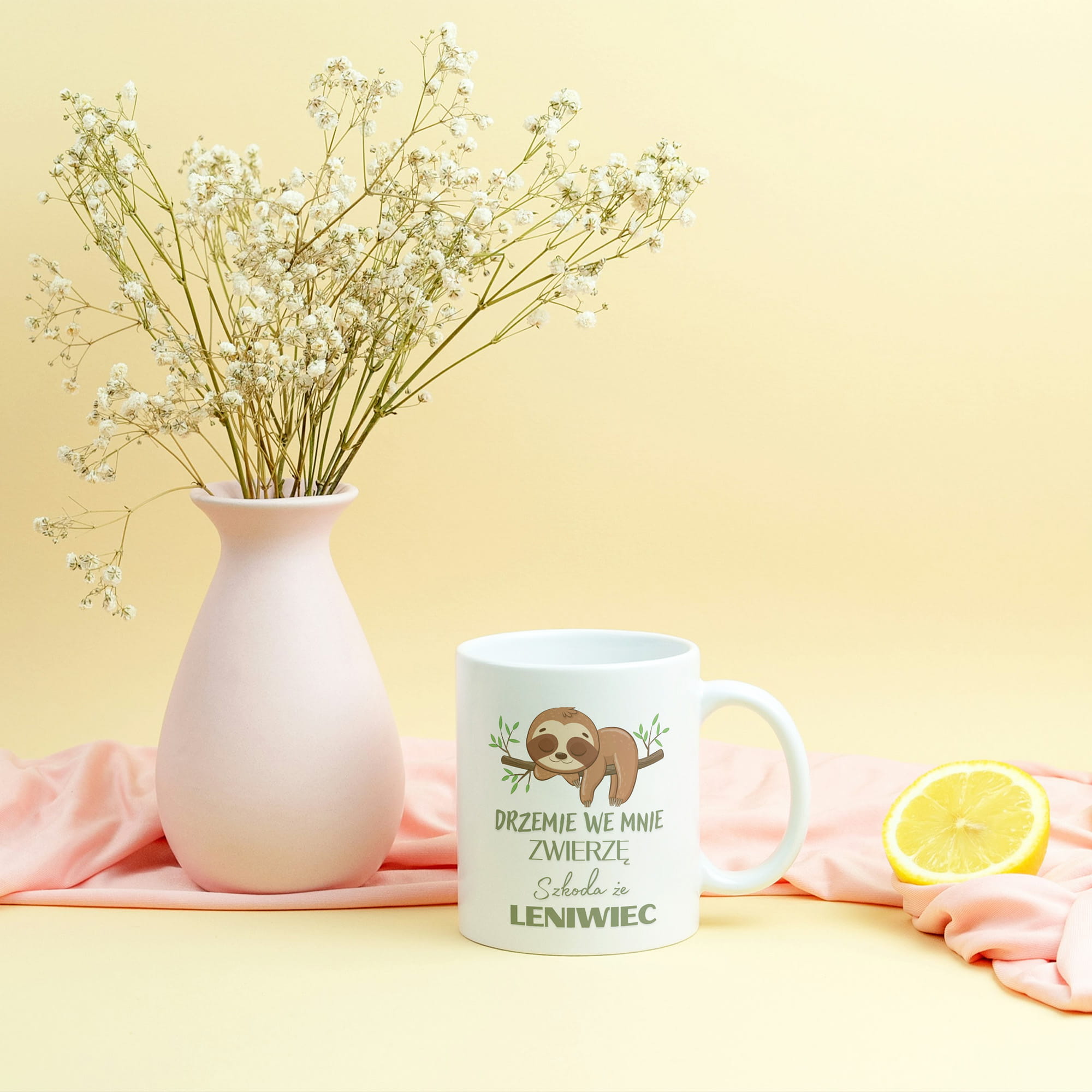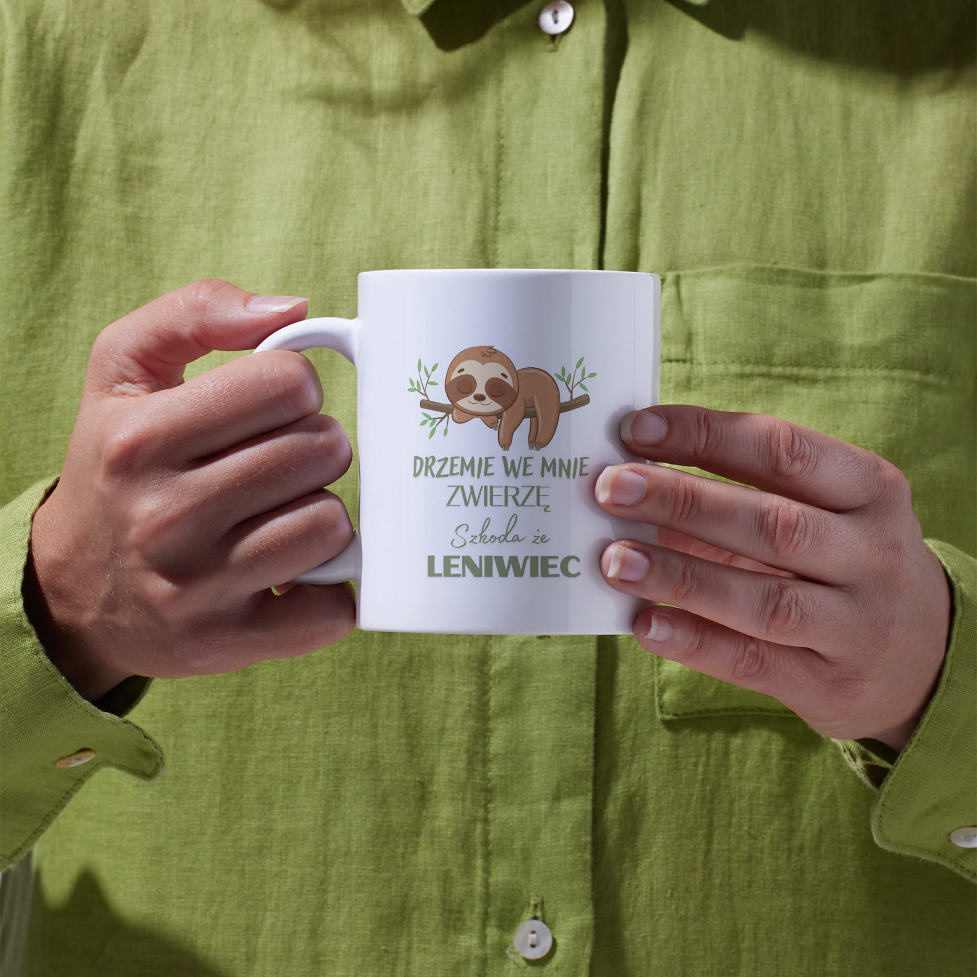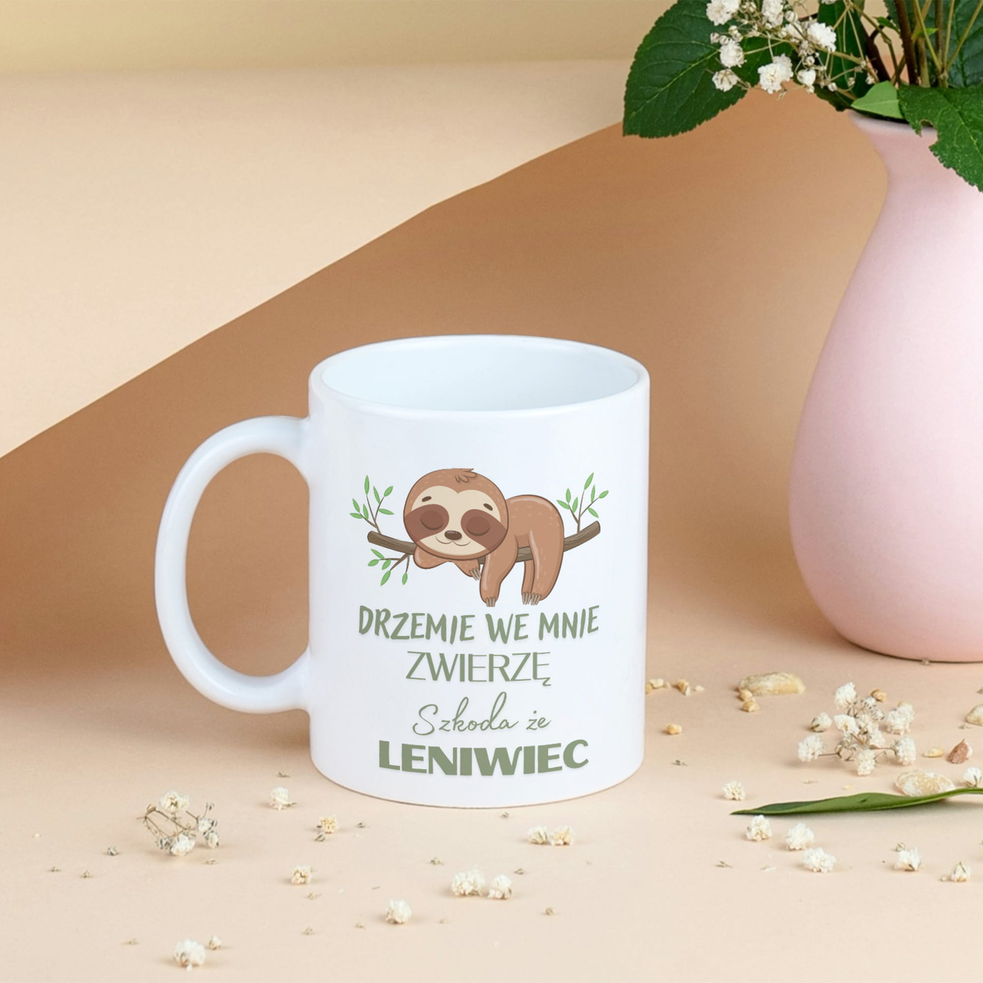 Kubek o pojemności 330 ml z napisem „Drzemie we mnie zwierzę, szkoda że leniwiec”
