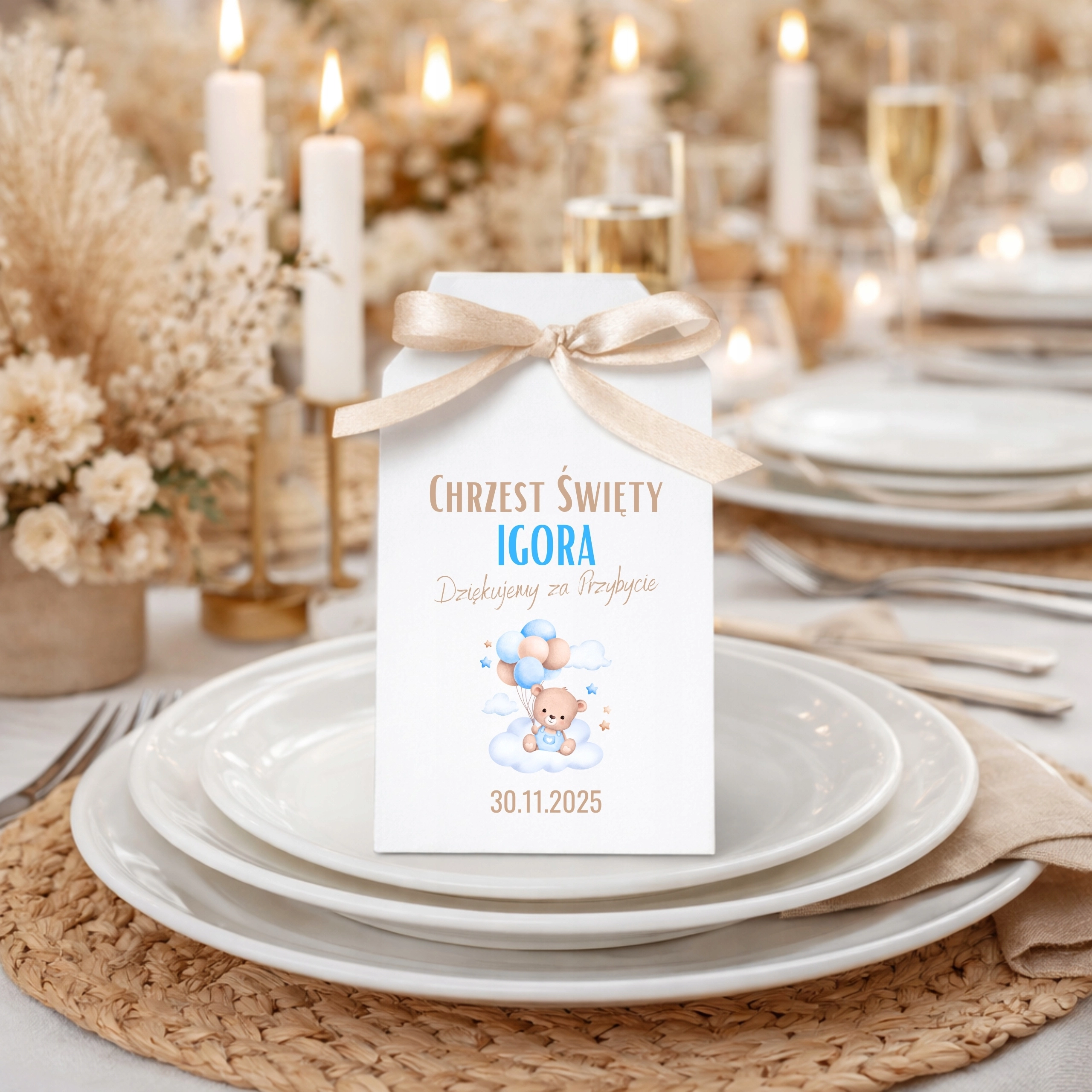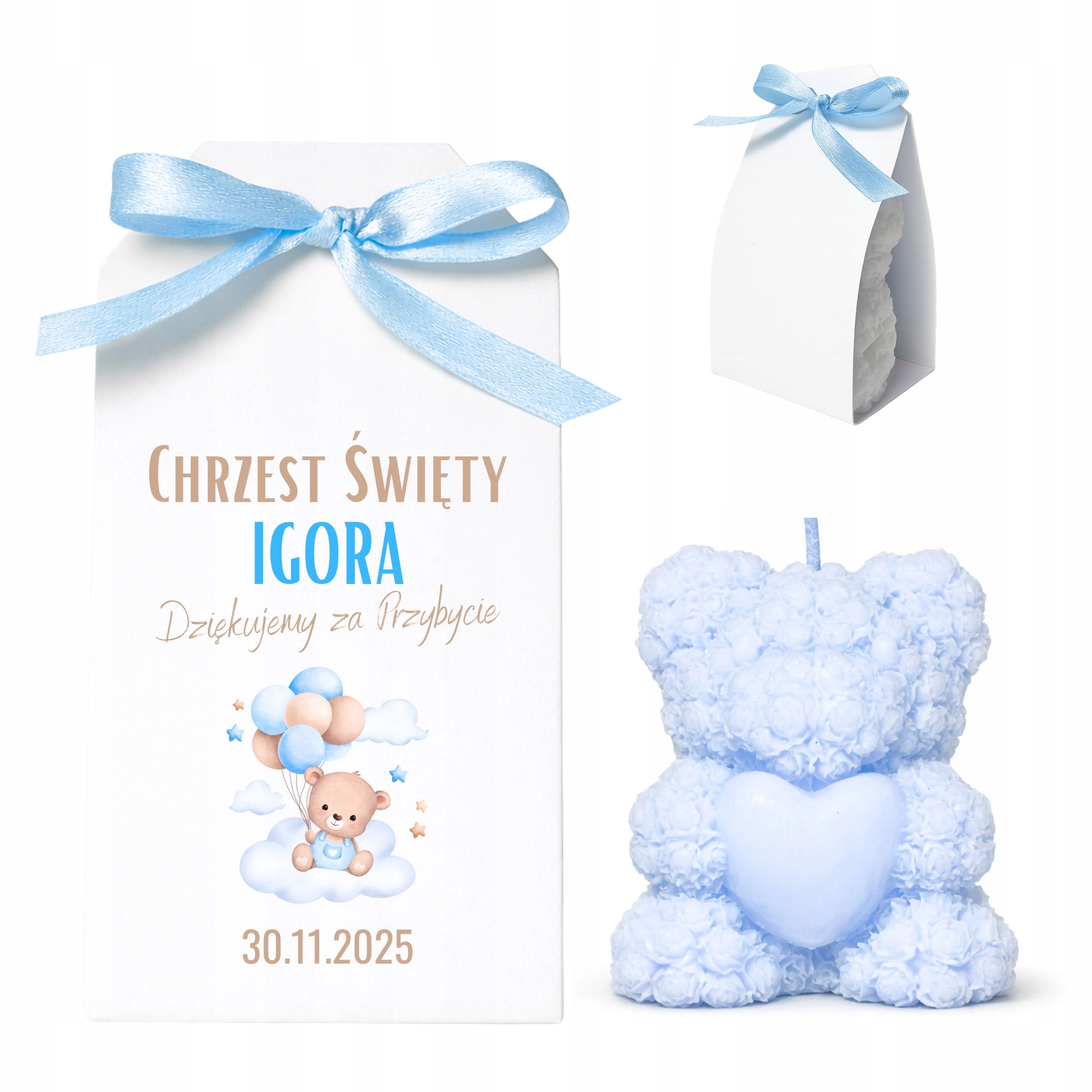 PODZIĘKOWANIA 3 SZT. CHRZEST ŚWIECA SOJOWA MIŚ PERSONALIZOWANE CHŁOPIEC